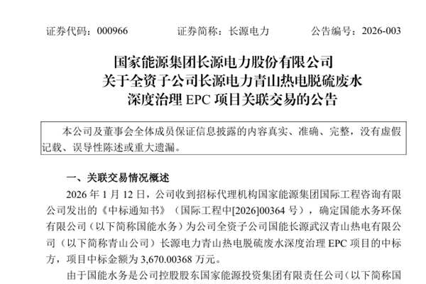 国家能源集团长源电力股份有限公司(简称:长源电力)公告称,公司于1月12日收到招标代理机构国家能源集团国际工程咨询有限公司发出的《中标通知书》,确定国能水务环保有限公司(下称“国能水务”)为公司全资子公司国能长源武汉青山热电有限公司(下称“青山公司”)长源电力青山热电脱硫废水深度治理EPC项目的中标方,项目中标金额为3,670.00368万元