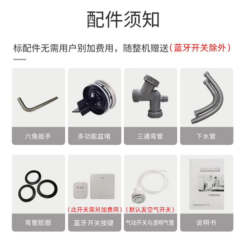 *开关:无线开关(免打孔)、空气开关(需要水池有预留孔)