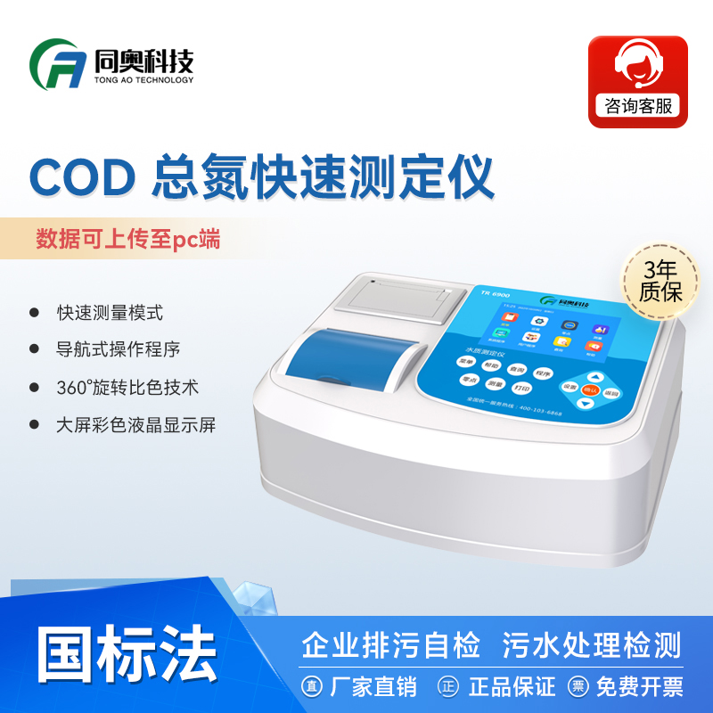 同奥科技 COD测定仪总氮分析仪TR-6900CN仪器可快速测定水中COD、总氮值,集成了同奥水质分析领域成熟技术,使整个分析系统更加完善,操作更加简单、快速,检测结果更加稳定可靠。仪器显示界面采用大屏液晶屏显示,按键操作,数据直读,操作简单省时;检测范围广,可拓展数十种检测参数,根据需求定制,达到资源利用优化,智能操作程序,可选择标准测量或连续测量模式,在快速性和准确性间自由选择,引导用户轻松完成操作。同奥科技 COD测定仪总氮分析仪TR-6900CN广泛应用于应急监测、工业废水、生活污水、污水处理、医药化工、食品、饮品、纺织印染、电镀、造纸、石油冶金、河流治理、科研单位、院校等领域。