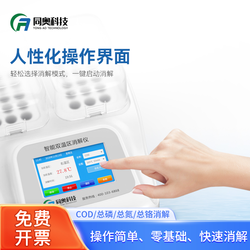 功能特点 1、 4.3 寸触摸显示屏,中文显示,实时显示当前温度和时间; 2、 内置 COD、总磷、总氮、总铬等标准消解模式; 3、 人性化操作界面,轻松选择消解模式,一键启动消解; 4、 双温区控制,独立操作、互不干扰,不同参数可同时消解。
