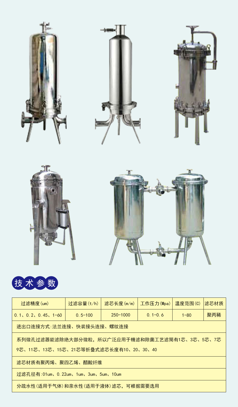 微孔过滤器孔径0.2-1um的滤膜过滤商务的统称。简称MF微孔过滤器是国内外近年来才开发的新型过滤设备。它可以滤除液体、气体的 0.1um 以上的微粒和细菌,它有过滤精度高、过滤速度快、吸附少、无介质脱落、耐酸碱腐蚀、操作方便等优点。现已广泛用于医药、化工、电子、饮料、果酒、生化水处理、环保等行业