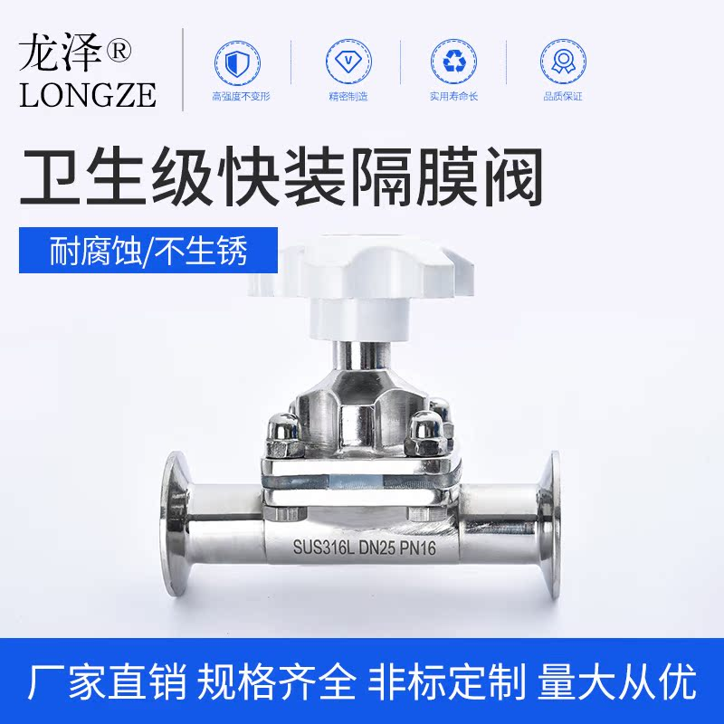 您当前的位置: 中链企通环保网阀门 卫生级快装隔膜阀 快装隔膜阀316L龙泽不锈钢食品卫生级直通快开卡盘式卡箍膜片阀门