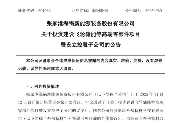 张家港海锅新能源装备股份有限公司(简称:海锅股份)公告称,公司于2025年11月12日召开第四届董事会第九次会议,审议通过了《关于投资建设飞轮储能等高端零部件项目暨设立控股子公司的议案》: 同意公司与张家港吾岳特材科技有限公司(下称“吾岳特材”)签署《项目战略合作协议》,由公司与吾岳特材共同出资设立控股子公司...