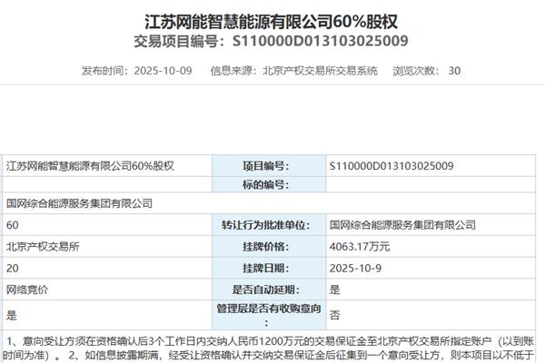 10月9日,江苏网能智慧能源有限公司60%股权在北京产权交易所挂牌转让,转让行为批准单位为国网综合能源服务集团有限公司,挂牌价格4063.17万元,采用网络竞价的方式。 标的企业注册资本8000万元,实缴资本5440万元。其中转让方国网综合能源服务集团有限公司认缴注册资本金额4800万元,实缴资本4800万元;盐城市国能投资有限公司...