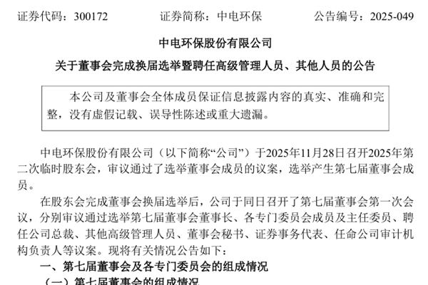 中电环保股份有限公司(简称:中电环保)公告称,公司于2025年11月28日召开2025年第二次临时股东会,审议通过了选举董事会成员的议案,选举产生第七届董事会成员。同日,公司召开了第七届董事会第一次会议,分别审议通过选举第七届董事会董事长、各专门委员会成员及主任委员、聘任公司总裁、其他高级管理人员、董事会秘书、证券事务代表、任命公司审...