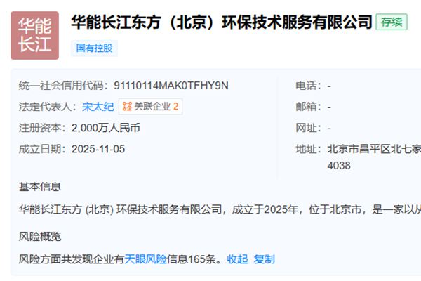 天眼查资料显示,近日,华能长江东方(北京)环保技术服务有限公司成立,法定代表人为宋太纪,注册资本为2000万元,经营范围包含: 【一般项目】技术服务、技术开发、技术咨询、技术交流、技术转让、技术推广;工程和技术研究和试验发展;工程技术服务(规划管理、勘察、设计、监理除外);工业工程设计服务;工程管理服务;水环境污染防治服务;水污染治...