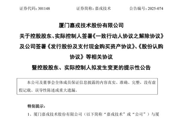 厦门嘉戎技术股份有限公司(简称:嘉戎技术)近日公告称,公司与厦门溥玉投资合伙企业(有限合伙)(下称“厦门溥玉”)等19名杭州蓝然技术股份有限公司(下称“杭州蓝然”)股东签署《发行股份购买资产协议》等交易协议,拟发行股份及支付现金的购买杭州蓝然100%股权;同时公司与厦门溥玉签署《股份认购...