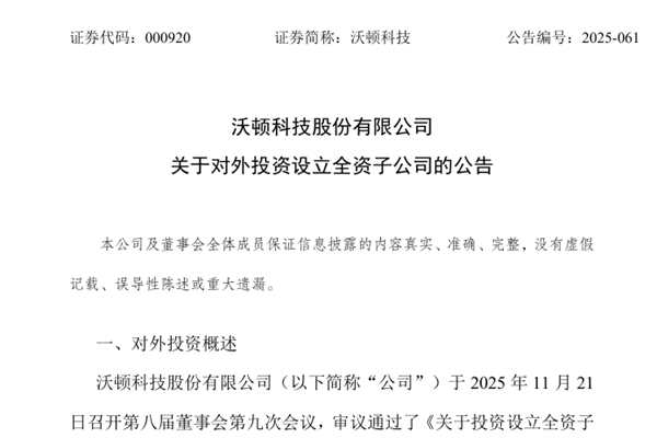 沃顿科技股份有限公司(简称:沃顿科技)近日公告称,公司拟以自有资金30,000万元投资设立全资子公司沃顿科技(南京)有限公司(下称“南京沃顿”,最终名称以工商登记为准)。 (一)公司名称:沃顿科技(南京)有限公司(暂定名,以工商登记为准) (二)类型:有限责任公司 (三)注册资本:30,000万元人民币 ...