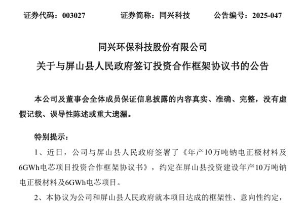 同兴环保科技股份有限公司(简称:同兴科技)公告称,近日,公司与屏山县人民政府签署了《年产10万吨钠电正极材料及6GWh电芯项目投资合作框架协议书》,约定在屏山县投资建设年产10万吨钠电正极材料及6GWh电芯项目,计划总投资约32亿元人民币。 同兴科技表示,本协议为公司和屏山县人民政府就本项目达成的框架性、意向性约定,旨在确立合作基本...