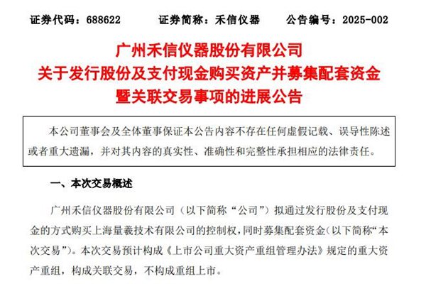 广州禾信仪器股份有限公司(简称:禾信仪器)1月4日公告称,公司通过发行股份及支付现金的方式购买上海量羲技术有限公司的控制权及募集配套资金事项(下称“本次交易”)有新进展。目前,本次交易所涉及的审计、评估等工作仍在开展中。在相关工作完成后,公司将再次召开董事会审议本次交易相关的议案,并按照相关法律法规的规定履行后...