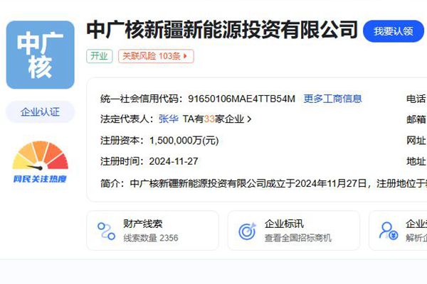 11月27日,中广核新疆新能源投资有限公司正式成立,注册资本150亿元,由中广核风电有限公司(53.1943%)、国新发展投资管理有限公司(40%)和中广核太阳能开发有限公司(6.8057%)共同持股。 新公司经营范围如下↓ 【许可项目】发电业务、输电业务、供(配)电业务。(依法须经批准的项目,经相关部门批准后方可开展经...
