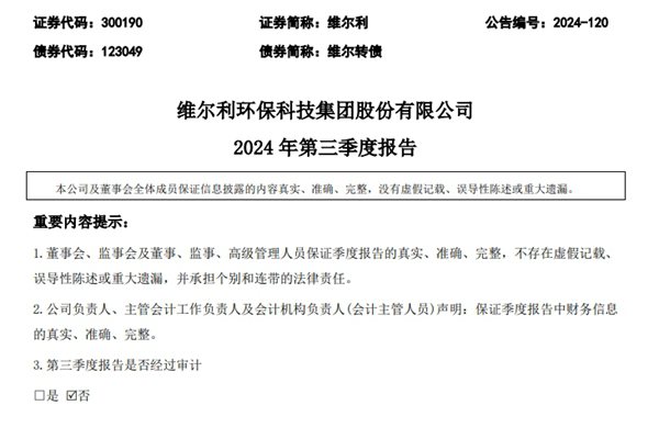 维尔利环保科技集团股份有限公司(简称:维尔利)近日发布《2024 年第三季度报告》,前三季度共实现营业收入约14.57亿元,同比减少8.56%;归属于上市公司股东的净利润约1335万元,同比减少37.14%;基本每股收益0.02元,同比减少33.33%。图源:维尔利公告 报告显示,2024年1-9月,维尔利净现金流为4643.77万...