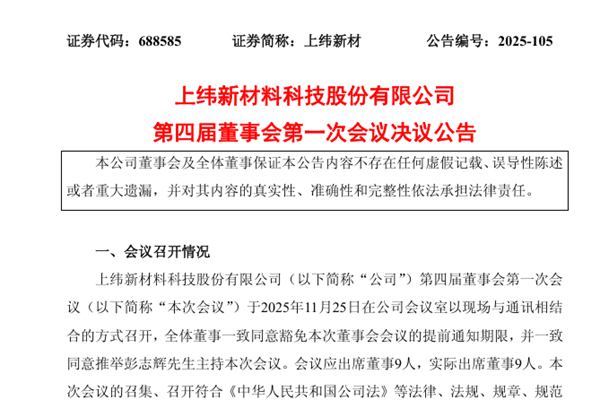 上纬新材料科技股份有限公司(简称:上纬新材)公告称,公司于2025年11月25日召开第四届董事会第一次会议,审议通过《关于选举公司第四届董事会董事长的议案》等。 ①审议通过《关于选举公司第四届董事会董事长的议案》 公司董事会选举彭志辉先生为第四届董事会董事长,任期自第四届董事会第一次会议审议通过之日起至第四届董事会任期届满之日止。...