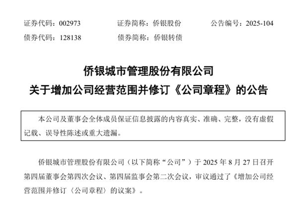 侨银城市管理股份有限公司(简称:侨银股份)近日公告称,公司拟调整公司经营范围,增加经营范围“财务咨询”和“法律咨询”(不含依法须律师事务所执业许可的业务),根据《经营范围规范表述查询系统》要求,公司需对现有经营范围中涉及禁用的表述进行调整变更,统一采用该系统规定的标准化经营范围表述,以确...
