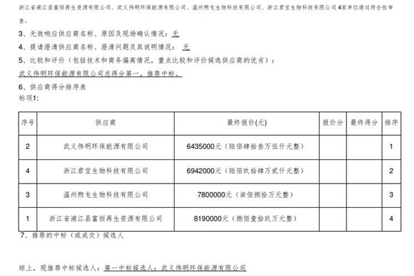 武义县城市、第二污水处理厂等污泥处置项目(第二次) 中标(成交)结果公告 一、项目编号:临[2023] 434号 二、项目名称:武义县城市、第二污水处理厂等污泥处置项目(第二次) 三、中标(成交)信息 1.中标结果: 中标(成交)金额(元):最终报价:6435000(元) 中标供应商名称:武义伟明环保能源有限公司 中标供...