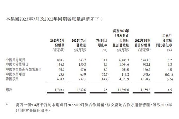 中国广核新能源控股有限公司发布《营运业绩最新情况:2023年7月发电量》公告,2023年7月公司及其附属公司按合并报表口径完成发电量1,749.4吉瓦时,较2022年同比增加6.5%。 其中,中国风电项目增加38.0%,中国太阳能项目增加4.1%,中国热电联产及燃气项目增加5.5%,中国水电项目减少62.6%及韩国项目减少14.4%...