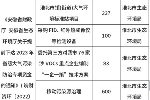 根据《安徽省财政厅 安徽省生态环境厅关于提前下达2023 年省级大气污染防治专项资金的通知》( 皖财资环〔2022〕1414号)和《安徽省财政厅 安徽省生态环境厅关于下达2023 年第二批省级大气污染防治专项资金的通知》( 皖财资环〔2023〕249号),淮北市共获得省级大气污染防治资金1951.4万元。现对分配情况进行公示。 公示...