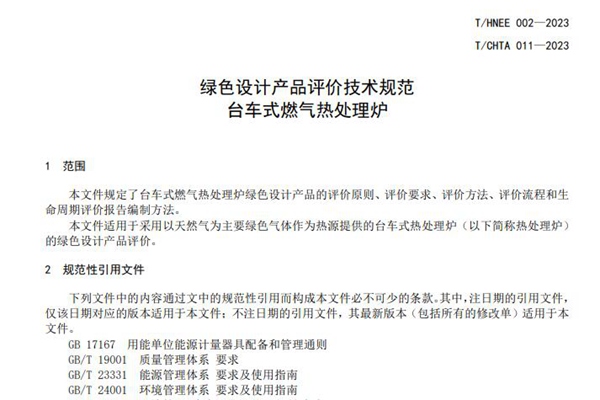 河南省能效技术协会发布《绿色设计产品评价技术规范 台车式燃气热处理炉》 团体标准,自2023年8月15日起实施。文件规定了台车式燃气热处理炉绿色设计产品的评价原则、评价要求、评价方法、评价流程和生 命周期评价报告编制方法。适用于采用以天然气为主要绿色气体作为热源提供的台车式热处理炉(以下简称热处理炉) 的绿色设计产品评价。(全文见附件...