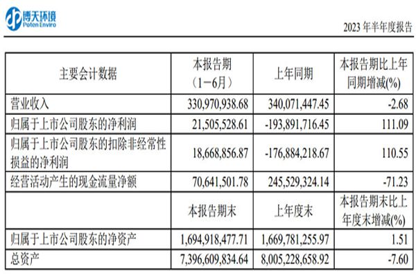 司法重整成功完成,博天环境集团股份有限公司(下称“博天环境”)正在逐步走回正轨。继一季度营收、净利润“双增长”后,8月9日,博天环境发布2023年半年度报告,上半年博天环境实现营收33,097.09万元,同比减少2.68%;但归母净利润为2,150.55万元,较去年同期大涨了111.09...