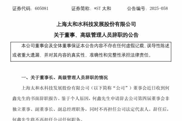 上海太和水科技发展股份有限公司(简称:*ST太和,下称“太和水”)近日公告称,鉴于个人原因,何鑫先生申请辞去公司第四届董事会非独立董事、副董事长、副总经理职务,同时不再担任公司法定代表人。辞任后,何鑫先生将不再担任公司任何职务。图源:太和水公告 据悉,太和水于6月下旬举办2025年第二次临时股东大会,选举吴靖...