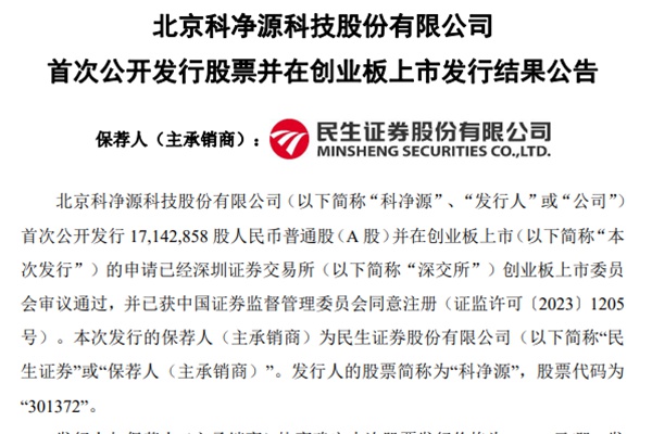 2023年8月1日,北京科净源科技股份有限公司首次公开发行股票并在创业板上市,股票发行价格为45元/股,发行数量17142858股。网上、网下认购缴款工作已于2023年8月3日结束。新股认购情况:网上投资者缴款认购的金额(元):356,823,810.00;网下投资者缴款认购的金额(元):397,276,110.00。...