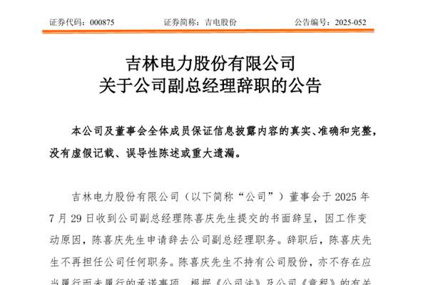 吉林电力股份有限公司(简称:吉电股份)公告称,已收到公司副总经理陈喜庆先生提交的书面辞呈,因工作变动原因,陈喜庆先生申请辞去公司副总经理职务。辞职后,陈喜庆先生不再担任公司任何职务。陈喜庆先生不持有公司股份,亦不存在应当履行而未履行的承诺事项。图源:吉电股份公告 申明:本站发布此信息的目的在于传播更多行业信息,相关数据仅供参考,不构...