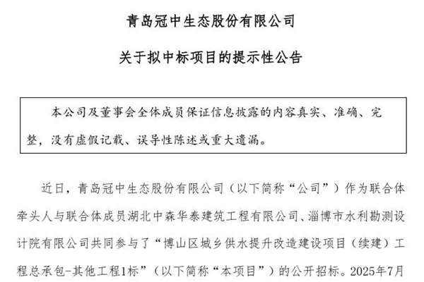 2025年07月07日,青岛冠中生态股份有限公司发布《关于拟中标项目的提示性公告》。图源:冠中生态公告 公司为博山区城乡供水提升改造建设项目(续建)工程总承包-其他工程1标第一中标候选人,投标报价为人民币239,891,400元。 1、项目名称:博山区城乡供水提升改造建设项目(续建)工程总承包-其他工程1标 2、招标项目编码:3...