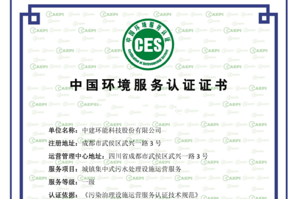 近日,中环协(北京)认证中心顺利完成中建环能运营资质认证现场审查,依据《污染治理设施运营服务认证技术规范》(RJGF303-2021),向中建环能正式颁发“城镇集中式污水处理设施运营服务一级认证证书”。-中建环能城镇集中式污水处理设施运营服务一级认证证书- 中国环境服务城镇集中式污水处理设施运营服务认证证书分...