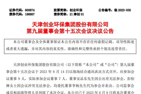 6月15日(2023),天津创业环保集团股份有限公司(简称:创业环保)发布“第九届董事会第十五次会议决议公告”。公告中明确,创业环保已经通过了关于设立天津天创环境技术有限公司(暂定名)的议案,拟设立轻资产运营公司,通过获得专业化运营类的“技术+产品+服务”等轻资产业务,辅助运营资产规模扩...