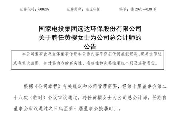 国家电投集团远达环保股份有限公司(简称:远达环保)近日公告称,根据《公司章程》有关规定和公司管理需要,经第十届董事会第二十八次(临时)会议审议通过,聘任黄樱女士为公司总会计师,任期自董事会审议通过之日起至第十届董事会换届时止。 据悉,黄樱女士曾任五凌电力会计中心筹融资管理主管、财务分析与信息高级主管,五凌电力北方分公司财务总监,五凌...
