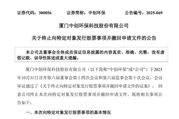 厦门中创环保科技股份有限公司(简称:中创环保)公告称,公司于2025年10月31日召开第六届董事会第十四次会议和第六届监事会第十次会议,会议审议通过了《关于终止向特定对象发行股票事项并撤回申请文件的议案》, 同意公司终止本次向特定对象发行股票事项并撤回申请文件。至此,中创环保原计划易主邢台潇帆科技有限公司(下称“邢台潇帆&...