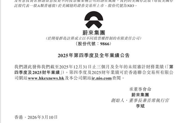 3月10日,蔚来集团(简称:蔚来)发布2025年第四季度及全年财务业绩。2025年第四季度,蔚来实现营收346.5亿元,同比增长75.9%,创历史新高。第四季度净利润为2.83亿元,实现公司成立以来首次单季盈利,相比之下,2024年同期净亏损71.12亿元。图源:蔚来公告 2025年全年,蔚来实现营收874.9亿元,同比增长33.1...
