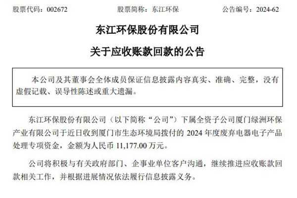 东江环保股份有限公司(简称:东江环保)近日公告称,公司下属全资子公司厦门绿洲环保产业有限公司于近日收到厦门市生态环境局拨付的2024年度废弃电器电子产品处理专项资金,金额为人民币11,177.00万元。 资料显示,厦门绿洲环保产业有限公司是国家第一批废弃电器电子产品处理基金补贴企业,是国家第四批”城市矿产示范基地。依托&...