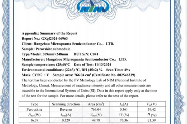 2024年11月,纤纳光电766cm2中型钙钛矿组件经中国计量院认证,获得了21.5%的转换效率(正反扫平均值)(图1)。该组件结晶工艺使用了纤纳光电新开发的冷冻激光表面钝化技术(简称“冻晶”技术)。这一新的里程碑,是继钙钛矿小组件23.65%的效率突破后,在“冻晶”技术助力下取得的又一...