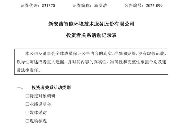 9月25日,新安洁智能环境技术服务股份有限公司(简称:新安洁)进行投资者关系活动,内容为重庆辖区上市公司2025年投资者网上集体接待日暨半年度业绩说明会,接待人员为副总裁兼财务负责人刘灵、董事会秘书蔺志梅、证券事务代表杨佚帆。 新安洁表示,目前,公司的战略转型方向明确,核心是从传统环卫服务商向“智慧人居环境投资运营商&r...