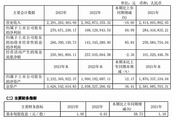 浙江荣晟环保纸业股份有限公司(下称“荣晟环保”)作为主要从事牛皮纸板纸、瓦楞原纸等再生包装纸产品以及瓦楞纸板生产制造的企业之一,近日公开的《2023年年度报告》显示,公司2023年年度实现营业收入22.91亿元,较上年同期下降10.6%;归属于上市公司股东的净利润2.71亿元,较上年同期增长60.99%,归属于...