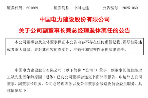 中国电力建设股份有限公司(简称:中国电建)公告称,公司董事、副董事长兼总经理王斌先生因年龄原因(退休)已向公司董事会递交书面辞职报告,申请辞去公司董事、副董事长职务、公司总经理职务以及公司董事会战略委员会委员职务。图源:中国电建公告 申明:本站发布此信息的目的在于传播更多行业信息,相关数据仅供参考,不构成投资建议。环保在线力求但不保...