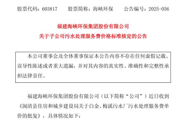 福建海峡环保集团股份有限公司(简称:海峡环保)近日公告称,根据政府相关文件精神:同意梅溪污水处理厂一期工程污水处理服务费单价核定为2.34元/吨,定价执行时间为2017年8月1日至2024年3月31日止;白金工业园区污水处理厂一期工程污水处理服务费单价核定为2.66元/吨,定价执行时间为2017年11月1日至白金工业园区污水处理厂二期...