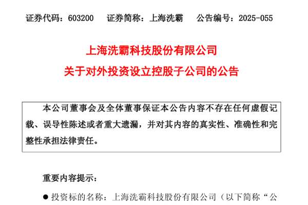 上海洗霸科技股份有限公司(简称:上海洗霸)近日公告称,公司将与有研稀土新材料股份有限公司(下称“有研稀土”)合资设立一家有限公司(公司名称待定,最终以工商部门登记名称为准,下称“新设子公司”)。新设子公司注册资本为人民币20,000万元,其中上海洗霸以货币和非货币资产出资,认缴出资额为1...