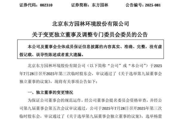 北京东方园林环境股份有限公司(简称:东方园林)近日公告称,为保证公司董事会的规范运作,经公司董事会提名委员会资格审查,并经公司第九届董事会第五次会议审议通过,公司于2025年7月28日召开2025年第三次临时股东会,审议通过了《关于选举第九届董事会独立董事的议案》,选举杨蕾女士、张晓宇先生担任公司第九届董事会独立董事,任期自股东会审议...