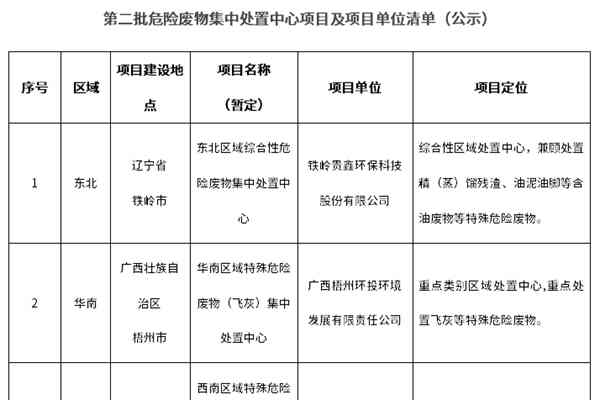 关于第二批危险废物集中处置中心项目及项目单位清单的公示 为贯彻落实《危险废物重大工程建设总体实施方案(2023-2025年)》(以下简称《实施方案》)中关于“建设20个区域性特殊危险废物集中处置中心”的要求,我部商国家发展改革委对相关省级生态环境部门和发展改革部门推荐的项目进行了审核,形成第二批危险废物集中处...