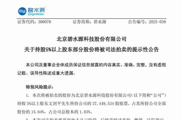 北京碧水源科技股份有限公司(简称:碧水源)近日公告称,公司持股5%以上股东文剑平先生所持的37,449,534股股票将被司法拍卖,占其所持全部股份的15.64%,占总股本的1.03%。 本次司法拍卖事项尚处于公示阶段,后续需经过竞拍、缴款、法院裁定、股权变更过户等环节,最终是否拍卖成功,具有不确定性。公司将持续关注该事项的进展,依法...