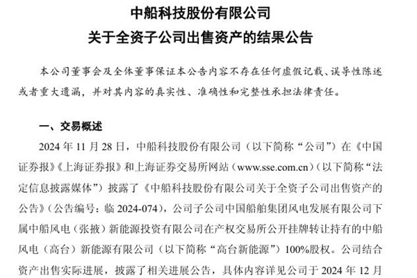 2025年06月26日,中船科技股份有限公司发布《关于全资子公司出售资产的结果公告》。图源:中船科技公告 2024 年11月28日,中船科技股份有限公司披露了公开挂牌事项,近日中船风电(高台)新能源有限公司100%股权出售事宜已全部完成。 此前5月17日,中船科技公告称,子公司中国船舶集团风电发展有限公司下属中船风电(张掖)新能源...