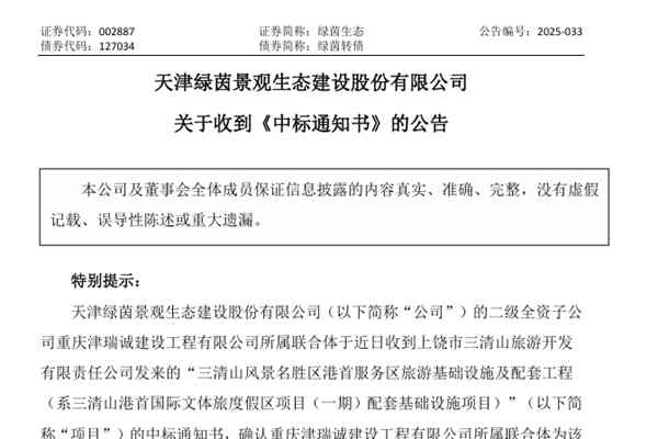天津绿茵景观生态建设股份有限公司(简称:绿茵生态)公告称,二级全资子公司重庆津瑞诚建设工程有限公司所属联合体近日已收到“三清山风景名胜区港首服务区旅游基础设施及配套工程(系三清山港首国际文体旅度假区项目(一期)配套基础设施项目)”(下称“项目”)的中标通知书。 中标项目主要情况 1、...