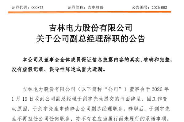 吉林电力股份有限公司(简称:吉电股份)近日公告称,公司已收到副总经理于剑宇先生提交的书面辞呈,因工作变动原因,于剑宇先生申请辞去公司副总经理职务。辞职后,于剑宇先生不再担任公司任何职务,亦不存在应当履行而未履行的承诺事项。 截至本公告披露日,于剑宇先生持有吉电股份股份220,000股。图源:吉电股份公告 申明:本站发布此信息的目的...