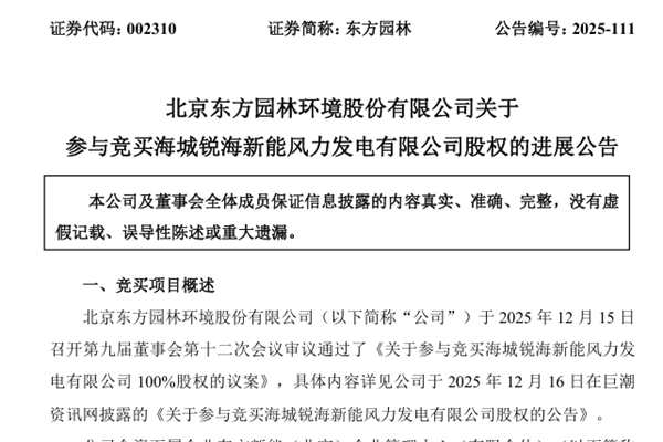 北京东方园林环境股份有限公司(简称:东方园林)公告称,近日,公司全资下属企业东方新能(北京)企业管理中心(有限合伙)(下称“新能企管中心”)收到天津产权交易中心送达的《受让资格确认通知书》,确认新能企管中心具备海城锐海新能风力发电有限公司(下称“海城锐海”)100%股权的受让资格。 东...