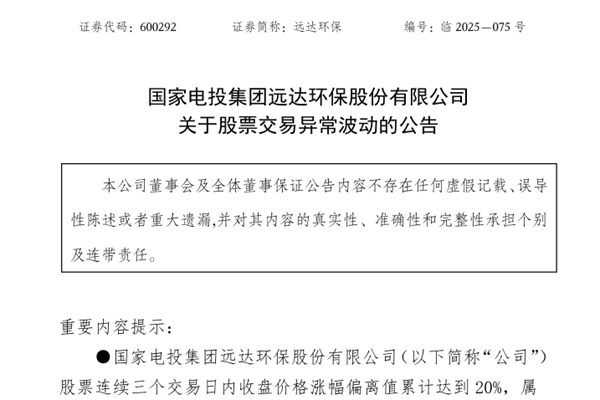 国家电投集团远达环保股份有限公司(简称:远达环保)公告称,公司股票于2025年11月5日至11月7日连续3个交易日股票交易价格涨幅累计达20.86%,短期内股价波动较大,可能存在短期涨幅较大后的下跌风险。公司所属证监会行业大类为“生态环保和环境治理业”,根据万得金融终端数据显示,截至2025年11月7日公司最新...