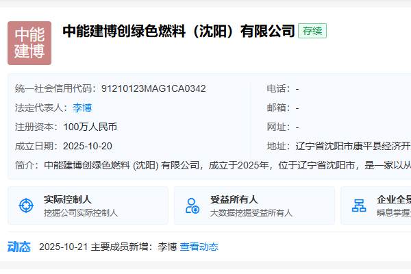 近日,中能建博创绿色燃料(沈阳)有限公司成立,注册资本100万元,注册地位于辽宁省沈阳市康平县经济开发区朝阳工业园集贤路,法定代表人为李博。经营范围包括许可项目:发电业务、输电业务、供(配)电业务;道路危险货物运输。一般项目:储能技术服务;站用加氢及储氢设施销售;电池销售。图源:天眼查 股东信息显示,中能建博创绿色燃料(沈阳)有限公...