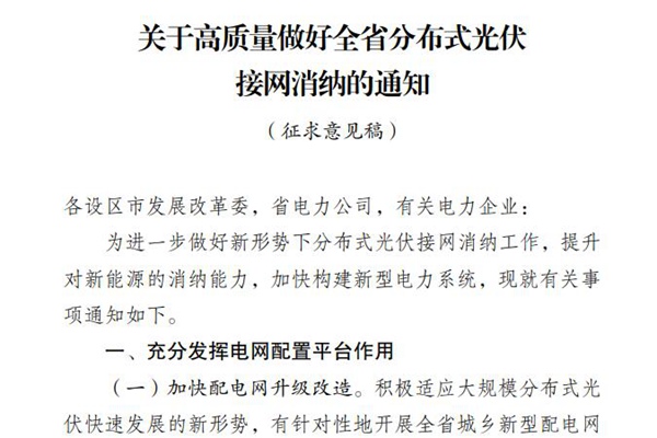 关于公开征求《关于高质量做好全省分布式光伏接网消纳的通知(征求意见稿)》意见的通告 为进一步做好新形势下分布式光伏接网消纳工作,提升对新能源的消纳能力,加快构建新型电力系统,我们起草了《关于高质量做好全省分布式光伏接网消纳的通知(征求意见稿)》(见附件),现向全社会公开征求意见。如有修改意见,请于7月23日前反馈至省发展改革委(能源...