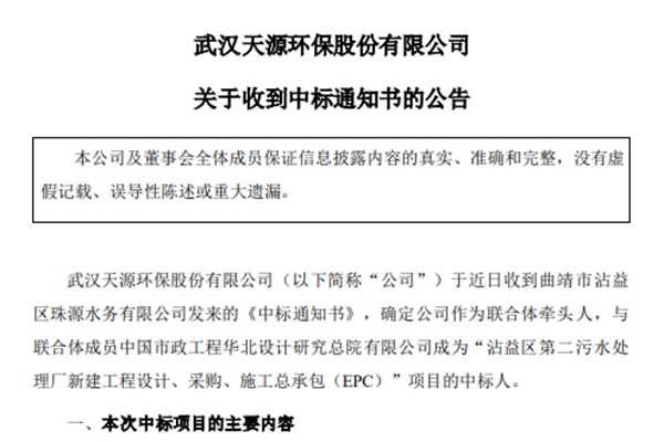 武汉天源环保股份有限公司2024年1月9日公告,公司近日收到曲靖市沾益区珠源水务有限公司发来的《中标通知书》,确定公司作为联合体牵头人,成为“沾益区第二污水处理厂新建工程设计、采购、施工总承包(EPC)项目的中标人。 项目成员:中国市政工程华北设计研究总院有限公司。项目建安施工费约45574.41万元,设备采购费9700...